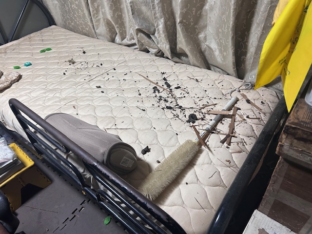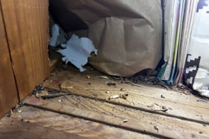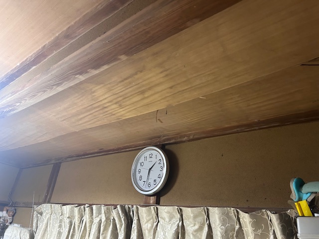 現場に伺うと、確かに天井に撓みが生じ、その隙間から獣の糞が落ちて散乱していました。